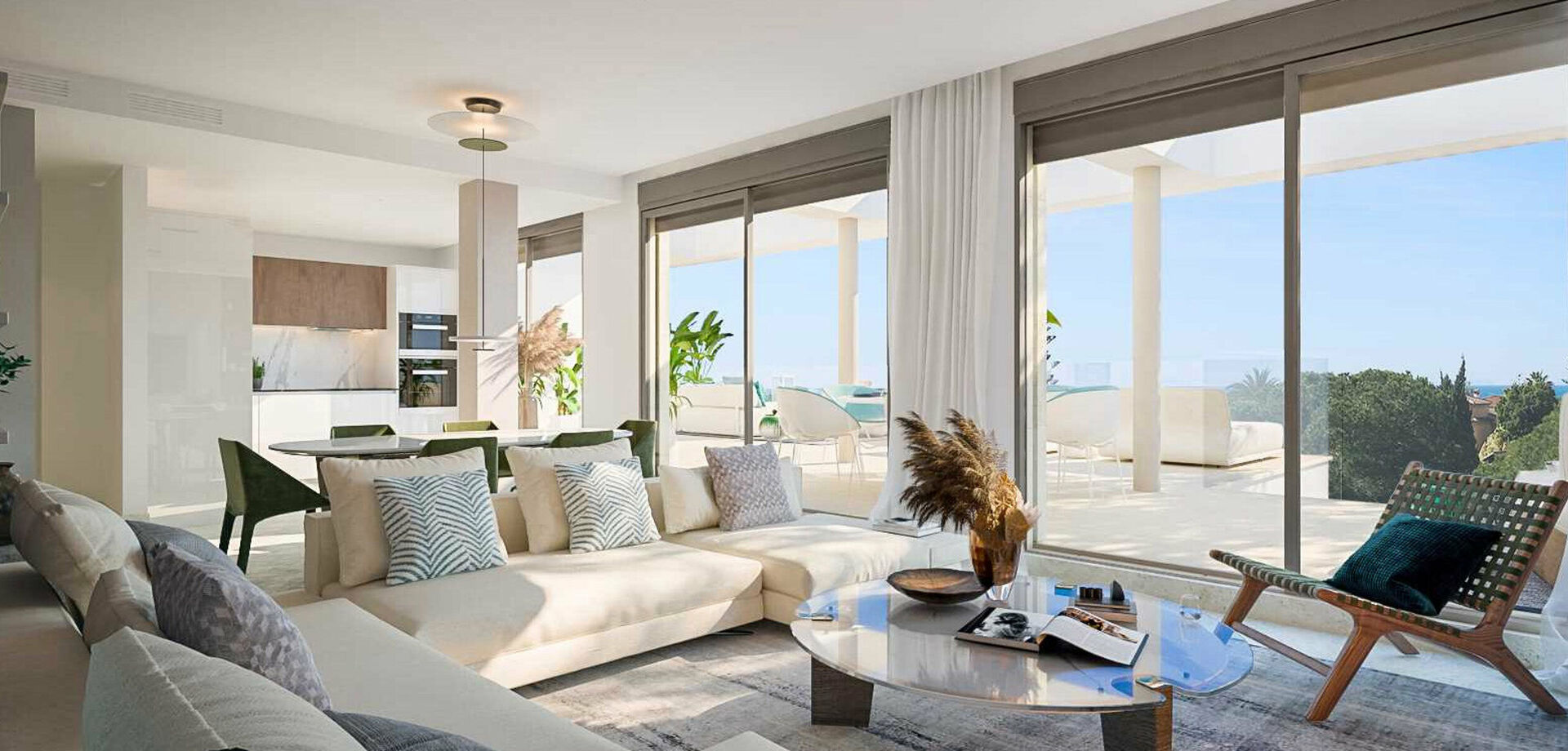 Le salon et la chambre principale sont dotés de fenêtres allant du sol au plafond, remplissant les espaces de lumière naturelle. Une vaste terrasse couverte offre des vues panoramiques.