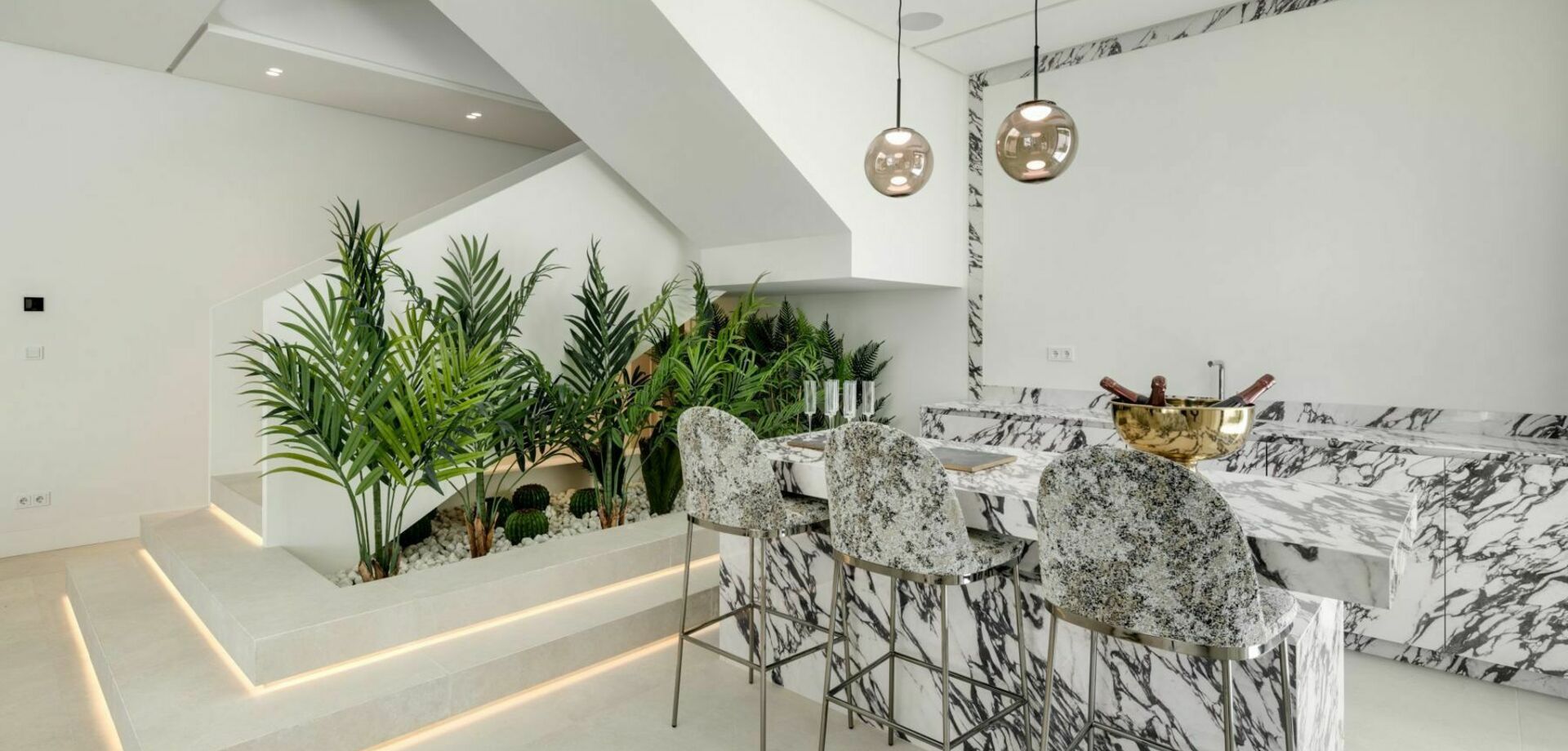 Stap binnen en ontdek de open indeling van de begane grond, waar binnen- en buitenleven naadloos in elkaar overgaan. De ruimte wordt overspoeld met natuurlijk licht door ramen van vloer tot plafond en is voorzien van een op maat gemaakte keuken met ultramoderne apparatuur en een schitterend met marmer bekleed eiland, dat zowel functionaliteit als elegantie belichaamt.